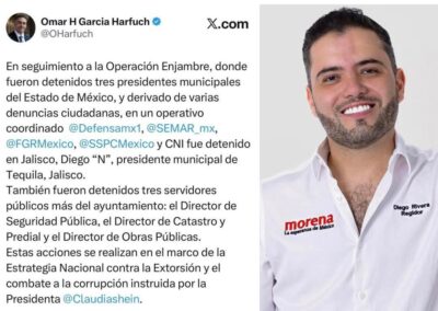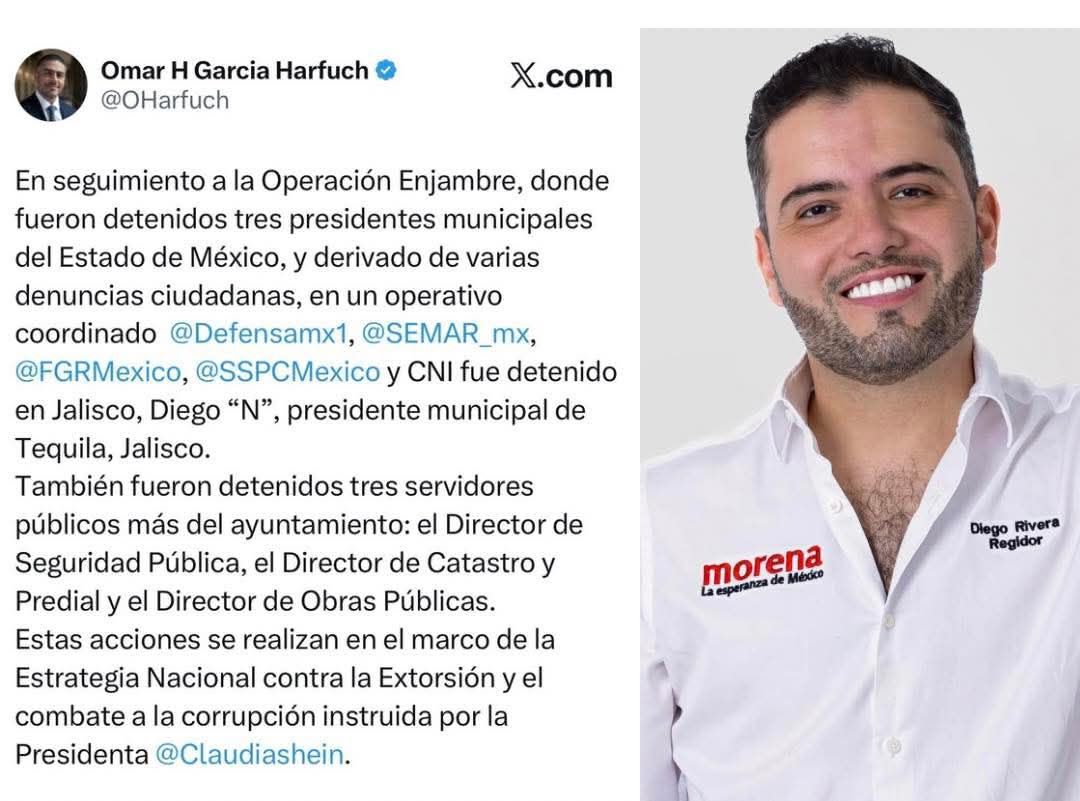 Diego Rivera fue detenido en 2026 acusado por la FGR de construir una “organización criminal innominada” en el Ayuntamiento de Tequila para extorsionar a comerciantes, secuestrar a pobladores y candidatos que compitieron en su contra. Rivera compitió dos veces por el puesto: la primera, secuestró a dos candidatos de Morena para obligarlos a renunciar, pero perdió frente al candidato del PAN; a pesar de ello, Morena volvió a hacerlo candidato. Rivera ganó en 2024 con el apoyo territorial y financiero del CJNG. Después, se comprometió a pagarle 40 millones de pesos anuales a ese Cártel, financiados por extorsiones. Entre otros casos, el gobierno de Rivera presuntamente extorsionó a José Cuervo por 60 millones de pesos y a otras empresas tequileras por 6 y 7 millones. También cobró 20 mil pesos mensuales a algunos comerciantes y 1500 pesos semanales a artesanos. La estructura criminal que Rivera construyó en el municipio es un ejemplo extremo del narcoestado, donde todo un gobierno municipal se convierte en una organización criminal. Actualmente, Rivera se encuentra en prisión preventiva en el penal de máxima seguridad del Altiplano, Estado de México.