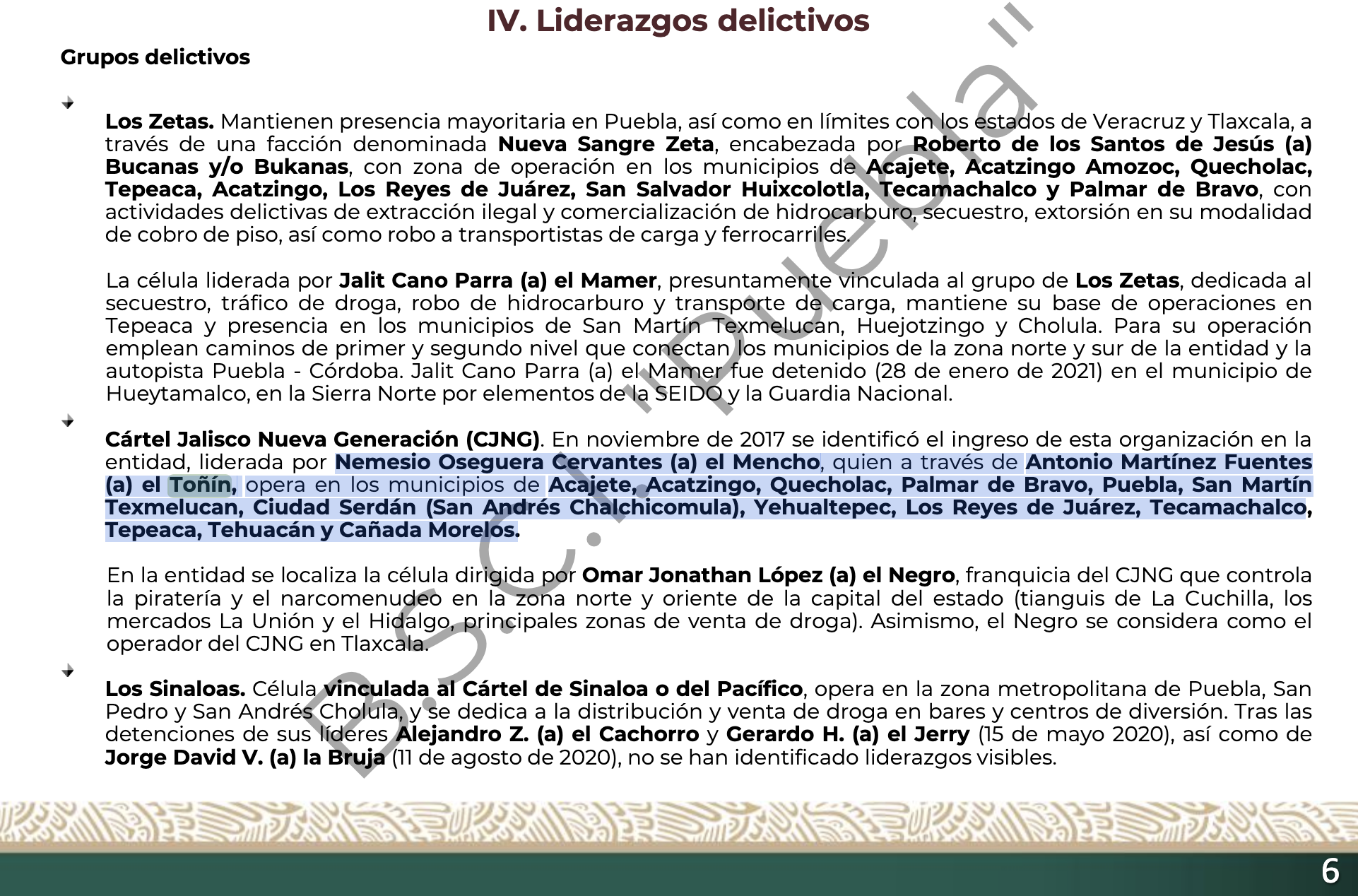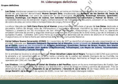 Según el informe, los grupos que operaban en el estado de Puebla en 2018 eran Los Téllez, Los Bukanas (antes colaboradores de Los Zetas) y un tercer grupo liderado por Antonio “El Toñín” Martínez Fuentes, escindido de Los Bukanas por problemas de pago. y aliado con el CJNG.